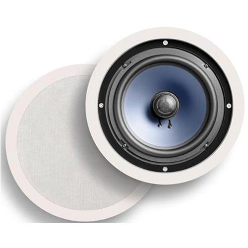The Polk Audio RC80i 2-way In-ceiling Speaker delivers incredible stereo sound to any room in your home from speakers you can barely see, without using any floor or shelf space. The RC80i is easy to install, requiring only that you cut a hole, feed the wires through, and simply drop the speaker in where it is held in place by rotating cams that safely secure the speaker with no extra assembly or mess. Once installed, the paintable grille and flange allows this in-ceiling speaker to virtually disappear in the room. The Polk RC80i utilizes a eight-inch dynamic-balance, mineral filled polymer-composite cone with a rubber surround that outlasts cheaper foam surrounds, as well as a one-inch ring-radiator tweeter with a 15-degree swivel mount. The swivel-mounted tweeter is aimable for direct high frequency control that ensures spacious imaging with amazing clarity, and well-balanced sound in any listening position, even off-axis listening positions, rather than in just a small sweet spot. Constructed of rust resistant hardware and durable, moisture resistant materials, the RC80i is safe for use in bathrooms, kitchens, saunas, or even under outdoor eaves, and a glass-filled composite baffle that provides a dense, acoustically inert platform for the speaker's high end components. This unit features strong composite driver baskets that keep moving parts in rigid alignment, a wide-dispersion design for even sound-coverage throughout even large rooms, and a wall-distance toggle switch that flattens frequency response when installation requires placement near a corner or adjacent wall. The RC80i also features a tweeter-level switch that lets you tailor the highs for your room acoustics, and is timbre-matched to the Polk Audio Monitor Series for seamless, enveloping imaging when used in a home theater system. What's in the Box - RC80i speakers (pair), 2 grilles, 2 cardboard templates with paint masks, owner's manual, and registration card.